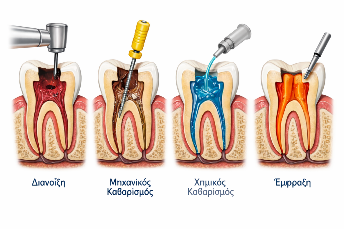 Πρόκειται για χημικό και μηχανικό καθαρισμό και έμφραξη των ριζικών σωλήνων ενός δοντιού όταν αυτό κρίνεται ότι πρέπει να συμβεί όπως σε καταστάσεις νέκρωσης ή μη αντιστρεπτής φλεγμονής του πολφού. Με αυτόν τον τρόπο διατηρούμε και διασώζουμε τα δόντια αυτά που μολύνθηκαν.
